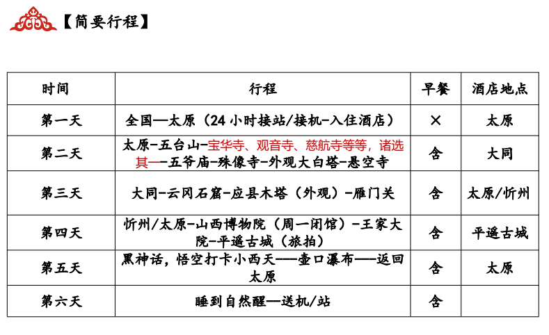 超值赠送 赠价值 368 元平遥旅拍--化妆,造型,古装戏服,专业摄影,户外实景,赠电子底片+精装照片穿越百年晋商,阅尽世间繁华,做一回晋商少奶奶,一朝步入 画卷,一院梦回百年,吹吹墙根的风,当一回官家千金大小姐。 高标住宿 全程四晚携程 4 钻酒店,特别升级一晚平遥特色 4 钻民俗客栈,睡眠无忧。 VIP 服务 全程一车一导包含全程金牌导游+VIP 服务 黑神话:悟空同款网红景点 四大佛教名山之首-(五台山)、一座(云冈石窟)、中国第一木塔(应县木塔)、中华第一关-(雁门关),空中楼阁