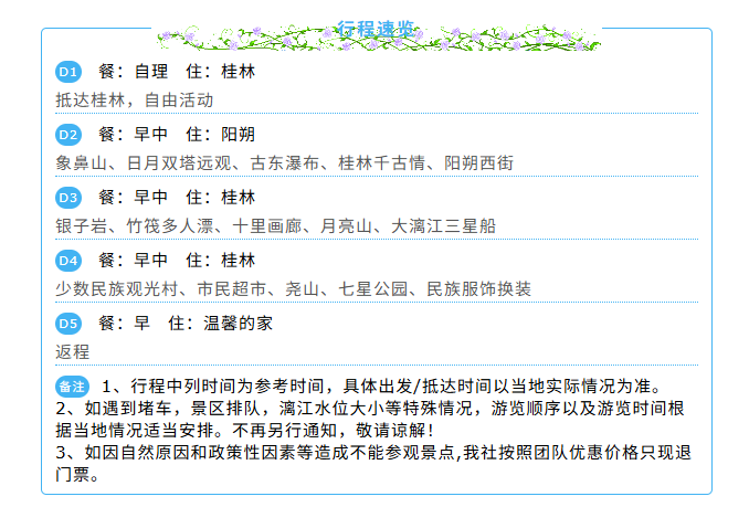1.此团行程为全国大散拼跟团游,客人到达当地后有可能存在等待其他客人的情况,请听从导游安排,请游客谅解!