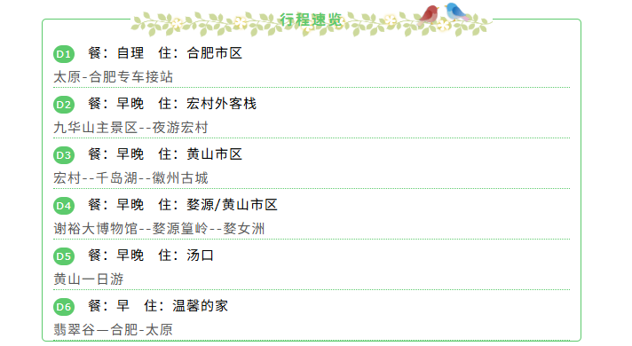 线路特色:合肥进出,专车专导 大牌景点:纵观九华山,登顶黄山,画里宏村,船游千岛湖,打卡婺女洲, 畅游篁岭,品徽州古城,翡翠情人谷 酒店特色:旅行社精选舒适商务酒店,市区升级一晚携程四钻酒店,宏村一晚特色民宿。 用餐特色:5早4正,品尝中国八大菜系之徽菜,升级正餐特色黄梅戏宴+徽州臭鳜鱼宴+徽州农家宴,体验徽菜文化独特魅力 适应人群:无地域限制,适合各类人群 品质承诺:全程精品包团,纯玩无购物,让您无需浪费时间,尽情畅游品质旅游!
