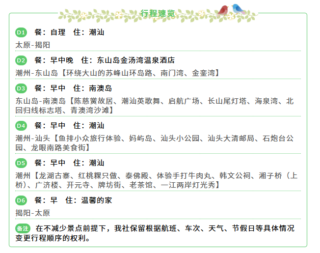 4、交通:太原-揭阳往返机票,当地空调旅游巴士;