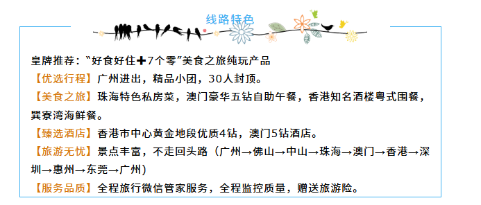 皇牌推荐:“好食好住✚7个零”美食之旅纯玩产品 【优选行程】广州进出,精品小团,30人封顶。 【美食之旅】珠海特色私房菜,澳门豪华五钻自助午餐,香港知名酒楼粤式围餐,巽寮湾海鲜餐。 【臻选酒店】香港市中心黄金地段优质4钻,澳门5钻酒店。 【旅游无忧】景点丰富,不走回头路(广州→佛山→中山→珠海→澳门→香港→深圳→惠州→东莞→广州) 【服务品质】全程旅行微信管家服务,全程监控质量,赠送旅游险。
