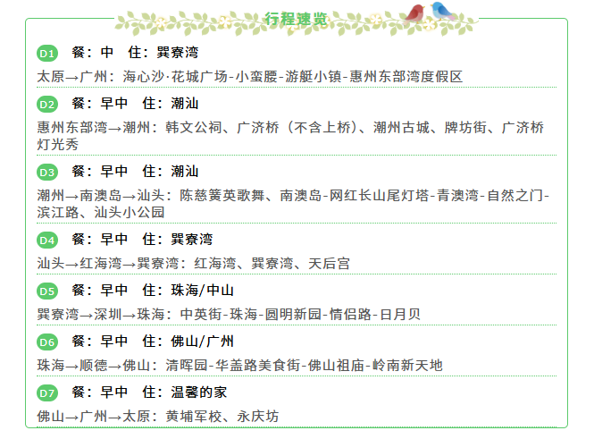 广州/深圳/珠海/潮州/汕头/南澳岛/顺德/汕尾/巽寮湾/穿越历史·拥抱海洋·品味岭南文化·大湾区深度双飞7日游 1、山西独立成团带全陪,全程贴心陪伴省心舒适出行,不浪费时间整整玩满7整天。 2、美食广东之旅全程用餐均为当地特色风味餐。 3、全程贴心安排网评三钻酒店特别升级一晚四钻度假酒店。 4、亲临被誉为“中国西点军校”的黄埔军校旧址,在每一砖一瓦间触摸近代史的脉搏,感受那段激荡岁月的浩然之气。 5、飞驰于宛如海上巨龙般的南澳大桥,登顶《国家地理》盛赞的南澳岛,在青澳湾的月牙形沙滩上,尽享“东