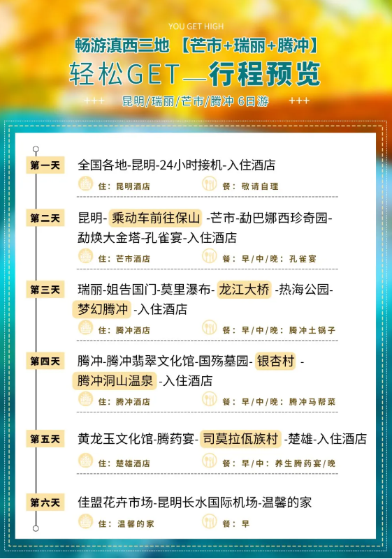 行程特色: 舌尖腾冲:追寻滇西独有的特色风味美食【傣王迎宾孔雀宴+养生腾药膳+马帮菜+土锅子】 金腾2大特色赠送:洞山养生温泉SPA+大型史诗极边绝唱《梦幻腾冲》 滇西三地:TOP 级景点【畅游芒市+瑞丽+腾冲】打卡精华景点 轻松出行:昆明动车-保山,尽享舒适旅程 舒适睡眠:全程精选商务舒适酒店+升级1晚准5温泉酒店 精华荟萃: 在创造多项世界桥梁奇迹的【龙江大桥】上拍照留念 温泉度假圣地、中国第二大热田、世界罕见的地热奇观【热海公园】 “一棵树”燃爆一座城的“金色梦想”那就是静谧梦幻的