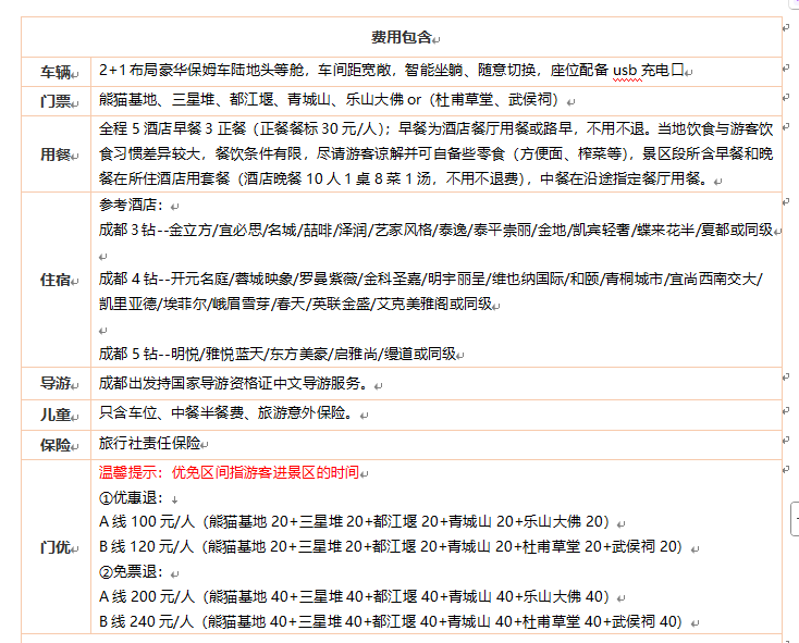 【忠于承诺】:100%真纯玩,0车销0购物店0自费0景中店0餐带店,违约承诺赔3000元/人写进合同 【增值服务】:第三天午餐后赠送川剧变脸表演 【精华景点】:熊猫基地、三星堆、都江堰、青城山、乐山大佛or(杜甫草堂、武侯祠) 【理想座驾】:2+1布局豪华保姆车陆地头等舱,车间距宽敞,智能坐躺、随意切换,座位配备usb充电口 【同团人数】:26-36人团 【严选酒店】:甄选豪华型酒店,明确备选酒店、不忽悠、无套路 【接送服务】:专车接送站、不拼不等、随到随走,出站口接客、帮拿行李