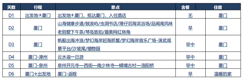 早餐后乘车开始当天的琴岛之旅。网红打卡【山海健康步道】——打卡“八山三水”盛景,山海健康步道完美串 联起厦门“八山三水”,始于邮轮码头,终于观音山梦幻沙滩,就势必要“翻山越岭”,沿线串联筼筜湖、狐尾山、 仙岳山、园山、薛岭山、虎头山、金山、湖边水库、五缘湾、虎仔山、观音山等岛内的“八山三水”。 健康步道串联起厦门岛中北部重要生态节点,形成贯穿本岛东西方向的山海步行通廊。是一条“景观之道、生态之道、 智慧之道”景点 · 世界文化遗产国家 5A 级景区—鼓浪屿+网红景点旅拍(赠送精美照片 10 张以上) 乘轮渡赴【5A 级景区—鼓浪屿】(耳麦 20 元/人自理)美丽五大城区之首—鼓浪屿,又有「海上钢琴之岛」的盛名。大海环抱,沙滩树影,小巷清幽,随处充满着风格各异且保留完好的充满历史意义的建筑,鼓浪屿与绿树相 拥,清新空气扑面而来,随处充满着值得旅拍打卡点,是厦门当之无愧的最佳拍摄地 「最美转角」在洋楼林立、街巷错落的鼓浪屿上,其实有很多转角都让人流连,但唯独这个转角被称为“最美转 角”。两条街巷交汇形成的 45 度夹角处,一栋形状像海上帆船的三层红色砖楼亭亭玉立,一旁绿树成荫红花掩映, 砖楼下方的木质路牌更增添了文艺气息。 「协和礼拜堂」婚纱照取景圣地 19 世纪中期,不少西方人来到鼓浪屿工作、生活。这些人多为虔诚的基督徒, 他们为举行主日崇拜,于是各差会(美国归正教会、英国伦敦公会、英国长老会)的信徒在鼓浪屿的鹿礁顶(亦称上 鹿礁)建造教堂。1863 年,这座新古典主义风格的教堂竣工,时称“国际礼拜堂”。此为鼓浪屿上最早的教堂。 「天主教堂-万国领事馆建筑博览」除了亲身沐浴在鼓浪屿的琴声中,还能看到岛上两座最著名的宗教建筑将在你 眼前呈现:古希腊式基督教堂,哥特式罗曼建筑特征的天主教堂,还有 3 大知名领事馆,都将给你带来全新的视觉 体验。 「面朝大海,踩沙踏浪」大海的深处贩卖着蓝色的孤独,温柔的人会带你离开海底。我们为您准备鼓浪屿上配套 设施最为完善,视野也最为开阔的。 【港仔后沙滩】沙滩上,一片童稚的呼叫。一伙赤裸裸的孩子,也赤裸裸着自己的欲望,拼命向着远方追逐、仿 佛追逐着曾经纯真的自己!体验漫步在鹭岛海滩,赤脚戏水踩沙的休闲时光。一路欣赏,一路拍照。 【老别墅下午茶】最有特色的茶点当属鼓浪屿手工馅饼,一路走来,想必大家也已饥肠辘辘,在下岛之前,我们 品一品闽南手工馅饼,尝一口凤梨酥,喝一杯果茶,为鼓浪屿之行画上一个圆满的句号。 今日提示: ●鼓浪屿全程步行,请各位游客轻装上阵! ●鼓浪屿轮渡实行实名制,请携带下单时所提供的证件出行(即下单时使用身份证,请携带身份证出行;下单使用护 照,请携带护照出行,以此类推),若证件不符,会产生无法上岛及船票损失,敬请知晓并谅解。 ●备注:鼓浪屿船班紧张,以实际出票船班时间为准! ●鼓浪屿上不允许导游使用扩音器,为了使游客更好的接收到导游的讲解,岛上有提供无线耳麦的有偿租赁服务,非 必需品,游客可根据自身需要决定是否租赁无线耳麦,绝不强制! ●鼓浪屿上特产店繁多,客人自由选购(并非旅行社购物店,请各游客不要误解)