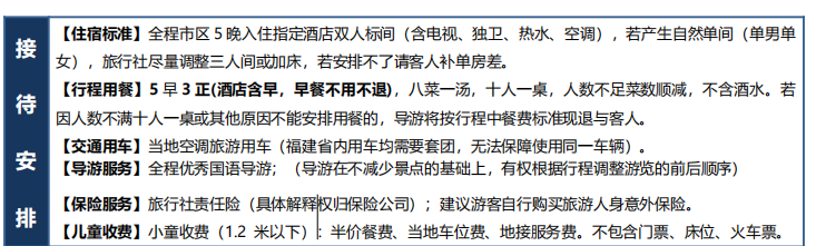 ①出团时必需携带身份证原件,16 周岁以下儿童持户口本登机,16 周岁(含)以上必需持身份证登机, 或派出所开具临时登机证明;如因证件原因导致无法出行,损失由客人自理。 ②关于房型:厦门标间紧张,尤其是节假日。我们会尽量确保两位男士住标间,其余均有可能安排大床, 如您对房型有要求,请务必在签约前确认房态,若无特殊需求,我们会酌情安排,如遇春节,国庆,旺季奇数 出行请预补房差,不然我社有权安排男男拼房,女女拼房 ③关于延住:可根据您的需求提供有偿延住服务 ④关于退费:因个人原因自愿放弃的景点均不可退费;有优惠证件(如学生证,导游证,老年证、军官证 等)的需提前跟导游说明,并在购票前出示优惠证件,导游会根据景区票价公示牌规定按旅行社协议价退费。 ⑤关于儿童:鼓浪屿实行人数限制,轮渡票需提前订票,订票后无法补差价补票。小孩身高如超过 1.5 米, 需 无法 提 保 前 证 通 与 知 我 我 社 方 预 买 订 全 的 票 班 轮 次 渡 一 票 致 , 。 如因客人信息传达错误引起无法登船等后果由客人自行负责。轮渡票临时补票 承担旅 ⑥ 游 行 者 程 由 中 此 未 产 经 生 协 的 商 额 的 外 擅 费 自 用 离 。 团 正 , 常 视 的 同 项 旅 目 游 退 者 费 违 ( 约 门 , 票 未 , 完 住 成 宿 部 ) 分 以 将 我 被 社 视 折 为 扣 自 价 行 为 放 标 弃 准 , , 我 均 社 不 不 以 再 挂 退 牌 费 价 , 为 并 准 不 。 予 船班或 ⑦ 航 行 班 程 晚 中 点 因 、 不 重 可 大 抗 礼 力 宾 (自然灾害、政府行为等)或不可归责于旅行社的意外情况(天气变化、道路堵塞、 活动等),导致本次团队旅游行程变更或取消的,或部分景点无法参观,则无法赔退,产生的损失费用行 社不承担任何责任,但我社负责退还游客未发生的费用 ⑧自由活动期间我社不提供车辆、导游服务、餐费等相关服务内容,游客在自由安排活动期间应在自己能 够控制风险的范围内选择活动项目,并对自己安全负责;特别提示游客:不宜参加游泳、潜水等有风险活动。 游客在自由活动期间出现的意外事故,旅行社不承担责任。 ⑨为保证旅游安全,请游客在出行前做一次必要的身体检查,凡有心脏病、高血压、气喘病、癫痫症、精 神病、糖尿病、法定传染病、贫血患者、孕妇及行动不便等者,或经医师诊断不宜出游者请勿报名。