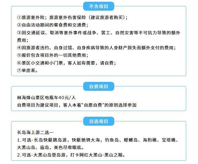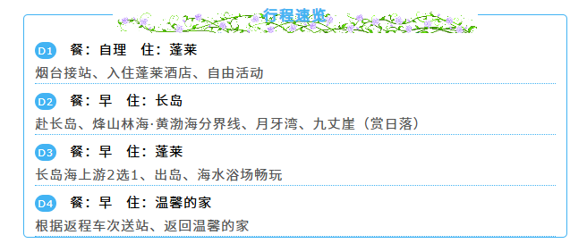 城市坐标·网红打卡 ★特别安排岛内一晚,赏九丈崖绝美日落。 ★4A级林海烽山,东临黄海,西临渤海,观黄渤海分界线,一脚踏两海,两耳听双涛。 ★4A级月牙湾,自然形成长约2000米的月牙长滩,在这里没有沙滩,却有绵长的球石滩。 可选项目超精彩 可选-长岛快艇跳岛游,快艇驰骋大海,钓鱼岛、螳螂岛、海豹礁、宝塔礁、大黑山岛、庙岛,美色尽收眼底。 可选-大黑山岛登岛游,打卡网红大黑山·黑山之眼。 畅游自我·特别安排半日海边沙滩自由活动 充足的活动时间,您可以自由的穿梭在热闹的街道,品味着地道的美食